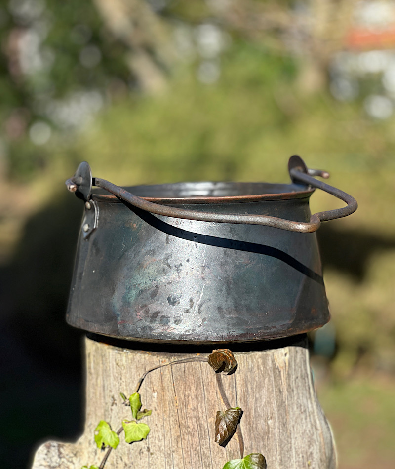 Außenseitig ist der Topf mit Schmiederuß geschwärzt und eingeölt, innen mit Öl gegen Rost eingerieben.