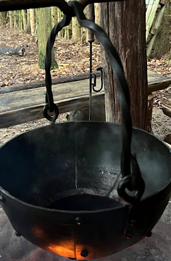 Dieser Stahltopf besteht aus mehreren, überlappenden Blechplatten, welche durch authentische Nieten verbunden sind. Da vernietete Töpfe jedoch häufig undicht sind, wurden dieser Topf innenseitig an den Stößen unauffällig verschweißt. Der Tragehenkel ist handgeschmiedet.
