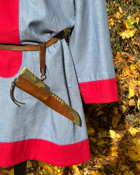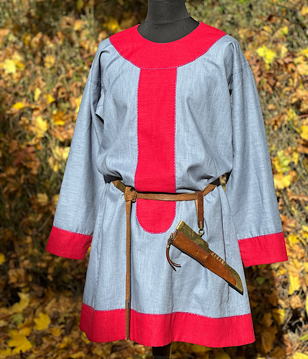 Wunderschöne Tunika aus reinem Leinen, mit kontrastfarbenen Besätzen in blau-rot. Die Tunika ist für eine fränkische Darstellung geeignet. Die Hand-/Ziernähte sind aus blauen Leinengarn gefertigt.