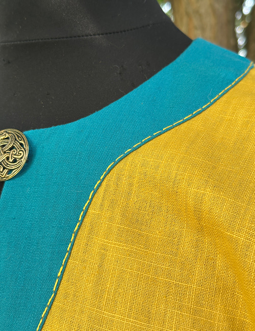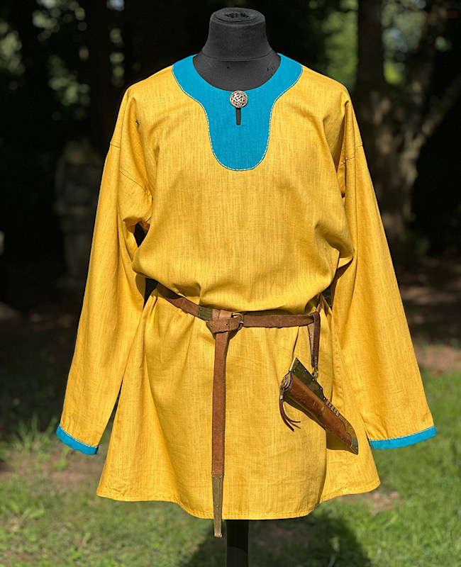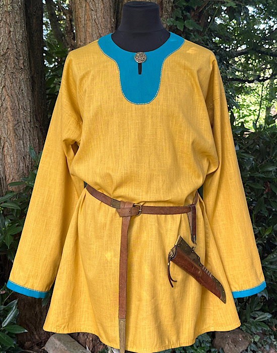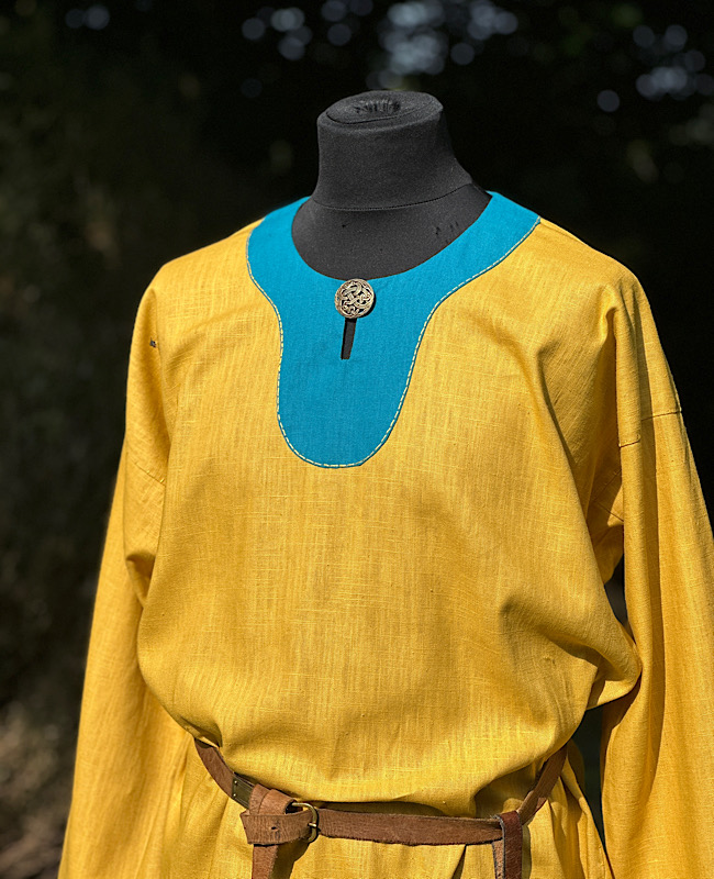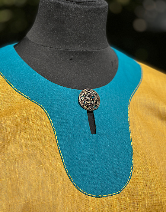 Behübscht ist die Tunika mit einer Scheibenfibel im Jelling-Stil. Diese ist nicht im Preis inbegriffen, kann hier aber im Shop käuflich erworben werden.