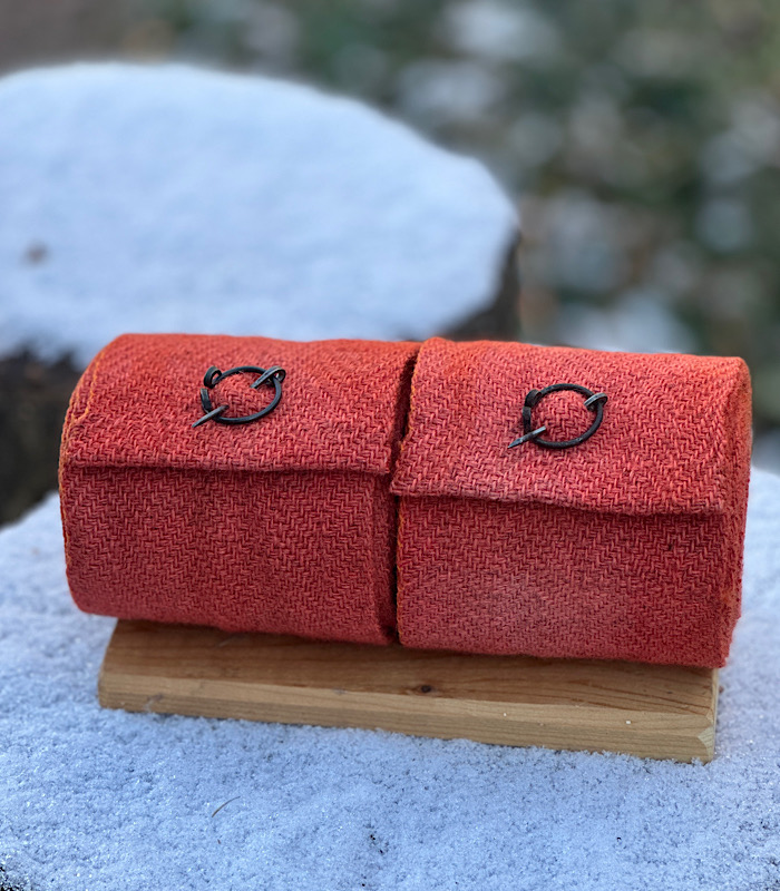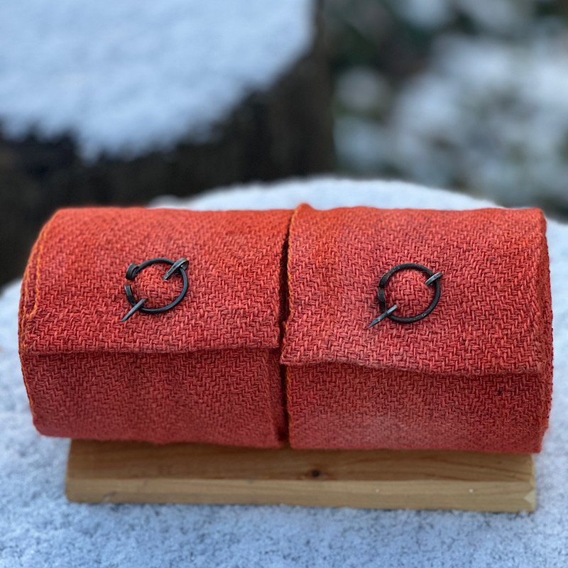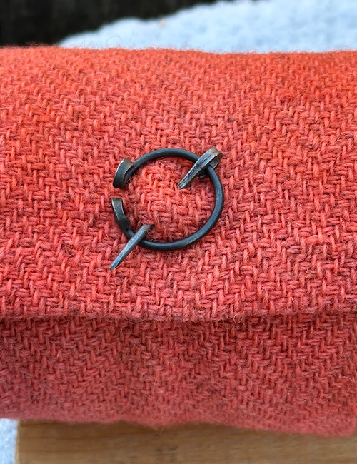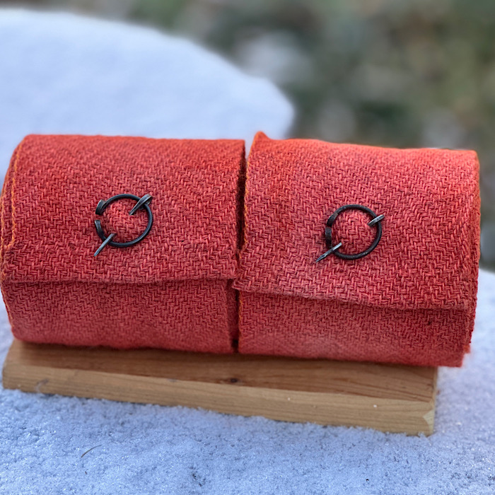 Sie sind mit handgemachten Stahlfibeln versehen und mit pflanzengefärbten Garn umsäumt.