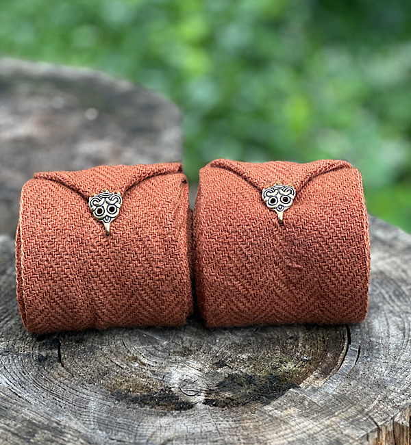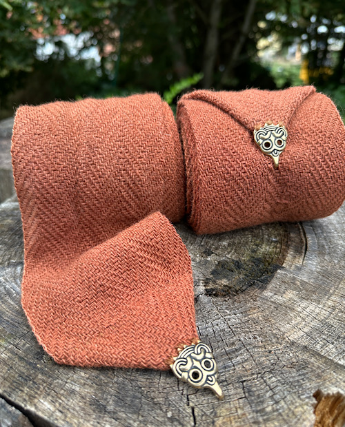 In liebevoller Handarbeit mit Roter Beete gefärbt, bringen diese Wickel einen wunderschönen rotbraunen Ton zum Vorschein. Sie sind mit pflanzengefärbtem Garn umsäumt und mit einem Wadenwickelhalter im Stil Birka, 10. Jh., Fund Birka-Grab 903, versehen. Dank ihrer hochwertigen Verarbeitung lassen sich die Wadenwickel besonders gut wickeln.