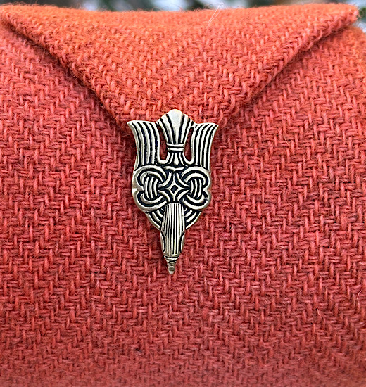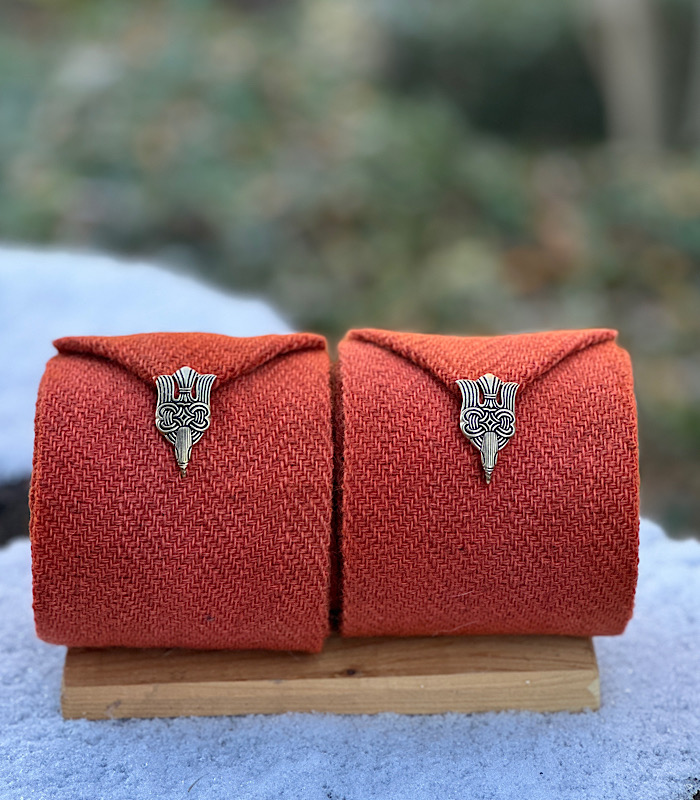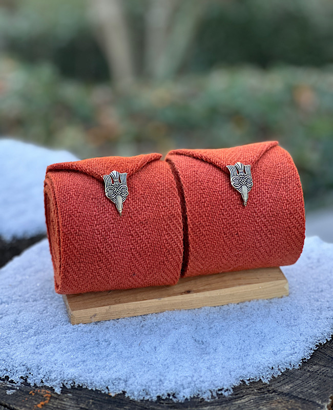 Sie sind mit pflanzengefärbten Garn umsäumt und mit Wadenwickelhalter, in Form zweier Raben nach Fund aus der Wikingersiedlung Chernigov in der Ukraine /10. Jh, versehen.