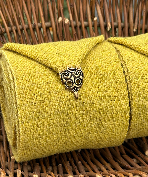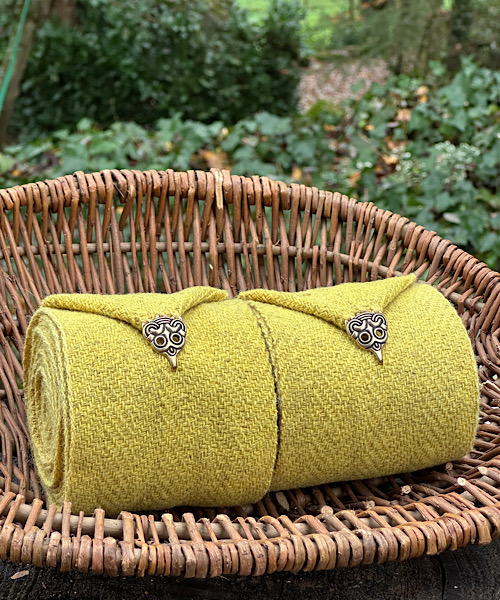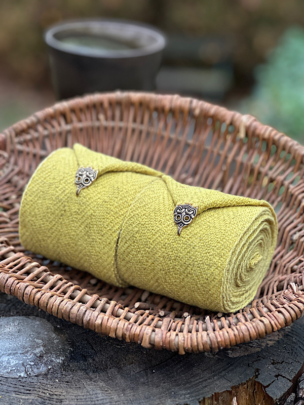 Sie sind mit pflanzengefärbten Garn umsäumt und mit einem Paar wunderschönen Wadenwickel–Haken, Replik aus der Wikingerzeit nach Fund,datiert auf das 10. Jh., Birka-Grab 903, aus hochwertiger Schmuckbronze, versehen.