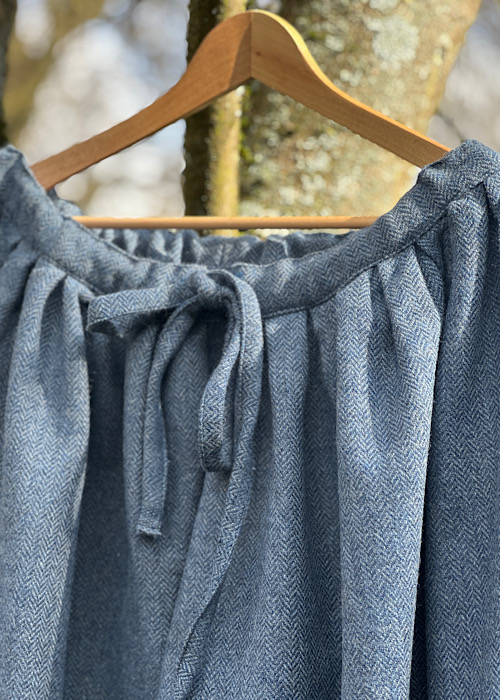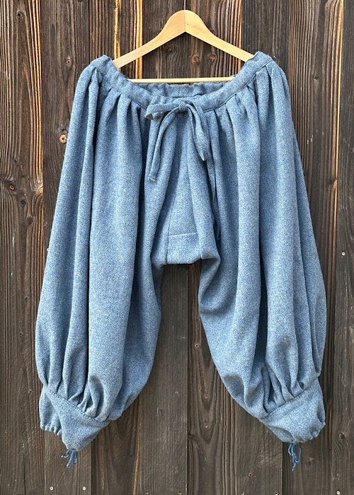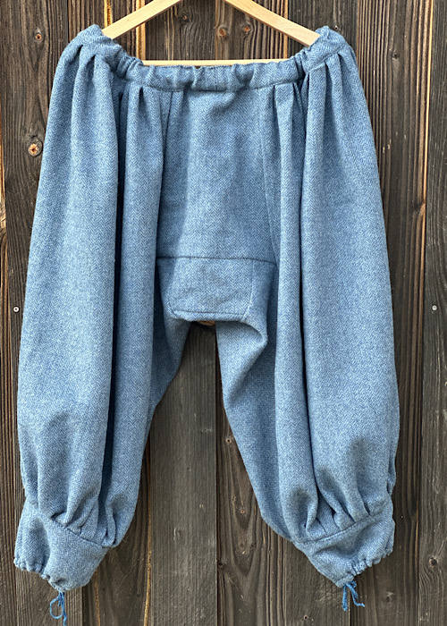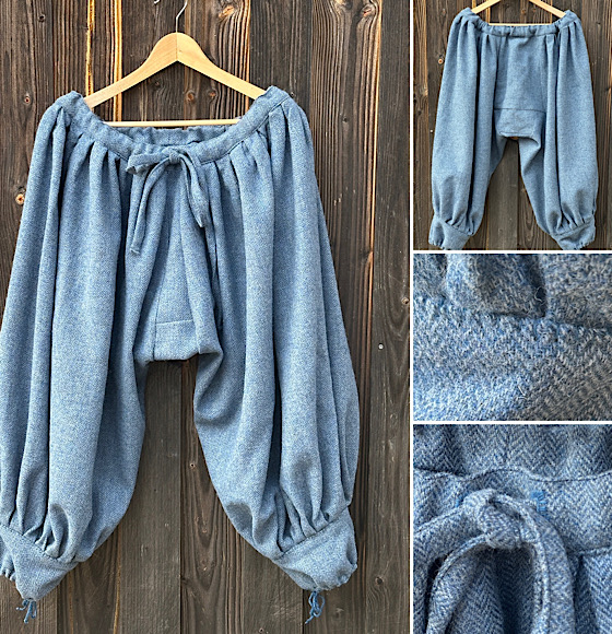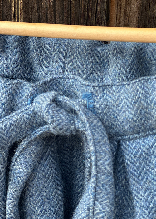Pluderhose /Pumphose aus reiner, blauer Schurwolle/Fischgrat mit Tunnelzug und passendem Gürtel. Der Stoff wurde in Kellerfalten gelegt und die Hose kann durch den Tunnelzug individuell angepasst werden. Für den perfekten Halt sind die Kniebündchen breit gefertigt, somit rutschen diese auch nicht aus den Wadenwickel raus. Zusätzlich sind sie auch noch mit einer Kordel versehen und können somit auch ohne Wadenwickel unter den Kien hochgebunden werden. Die Hand-/Ziernähte sind aus pflanzengefärbten Garn gefertigt.