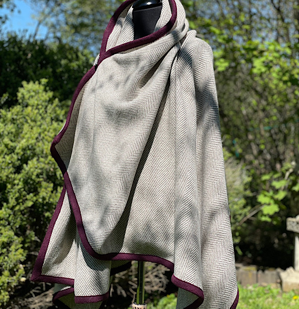 Wunderschöner Rechteckmantel aus ganz toller, reiner Schurwolle/ Fischgrat mit kontrastfarbenen Besatz in dunkelrot/beere.