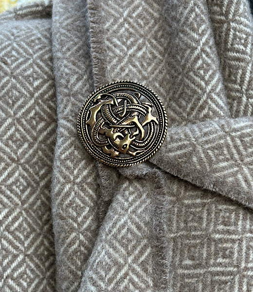 Als Verschluss dient hier eine ganz bemerkenswerte und wunderschöne Wikinger-Fibel, die aus hochwertiger Bronze gefertigt ist und durch ein einzigartiges Design besticht, das einen feuerspeienden Drachen darstellt, der sich in einem klassischen Wikinger-Muster windet.