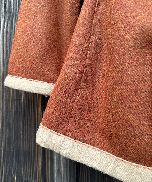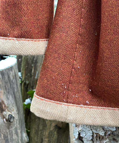 Wunderschöne Tunika aus reiner Schurwolle, mit kontrastfarbenen Besätzen und eingesetzte Geren an den Seiten und Ärmeln, die für Bewegungsfreiheit sorgen. Die Hand-/Ziernähte sind mit pflanzengefärbten Wollgarn gefertigt.