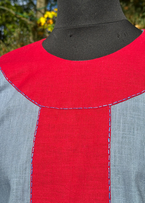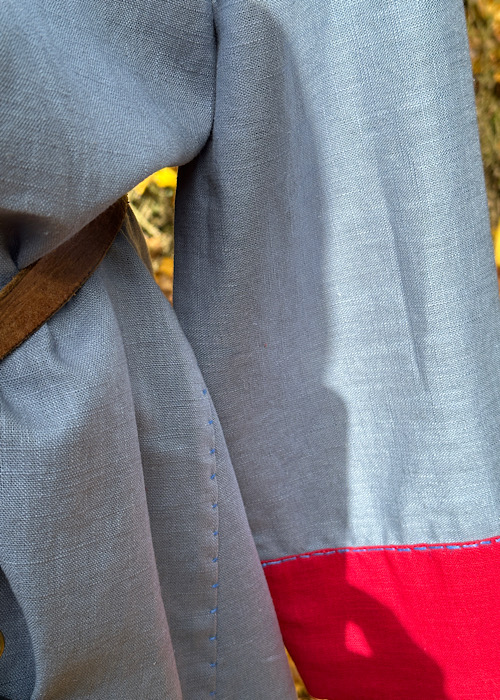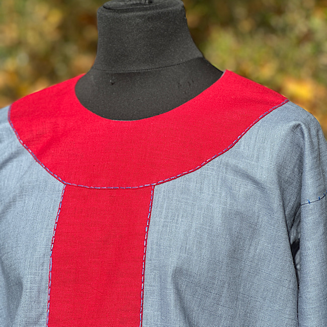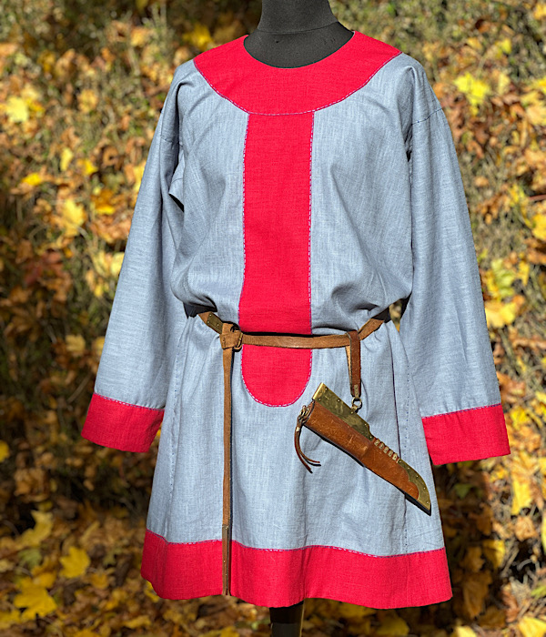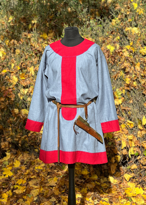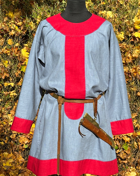 Wunderschöne Tunika aus reinem Leinen, mit kontrastfarbenen Besätzen in blau-rot. Die Tunika ist für eine fränkische Darstellung geeignet. Die Hand-/Ziernähte sind aus blauen Leinengarn gefertigt.
